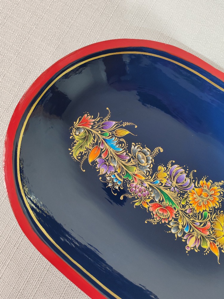 Batea de Laca Perfilada de Pátzcuaro: El primer proceso se le conoce como perfilado y consiste en decorar con pincel a mano alzada todo lo correspondiente al perfil del dibujo, utilizando para decorar una pasta llamada mordente, hecha artesanalmente por los mismos artesanos y misma que sirve como pegamento para la hoja de Oro. El segundo paso consiste en aplicar la hoja de oro 24 horas posteriores al perfilado, la lámina se adhiere únicamente a donde fue hecho el dibujo con el pincel y el mordente. Por último, se rellenan todos los espacios con colores oleos con la técnica original, que consiste en cada espacio lleva su color base, un color más claro que sirve visualmente como luz y otro color más obscuro que funciona como sombra. Finalmente, cada pieza es recubierta a mano con resina poliéster para proteger la pintura y los materiales.