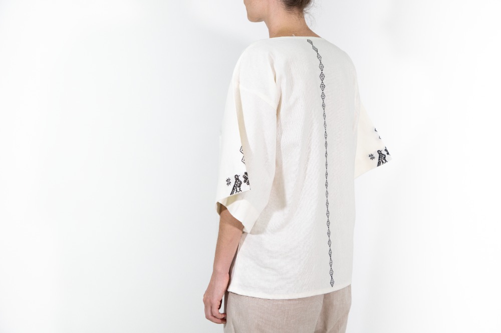 La blusa Kimono es resultado del laboratorio de diseño de Ensamble Artesano, donde se brindaron capacitaciones de corte y confección al grupo artesanal para el fortalecimiento de sus capacidades técnicas y creativas. Blusa compuesta 5 piezas, bordado de hilván en mangas y centro de espalda. Tela lino Luanda color marfil de 1.5 metros por blusa, 1 madeja de hilo vela color verde quetzal y 1 madeja de hilo vela color azul marino, En el cruce de frente tiene dos botones y ojales para sujetar la parte delantera.