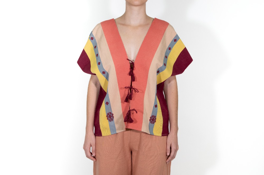 Esta blusa surge a partir de una experimentación con hojas de papel de colores de diferentes grosores y bocetos que las mismas artesanas hicieron después de ver ejemplos de varias siluetas de blusas de distintos diseñadores. La paleta de color y el patrón