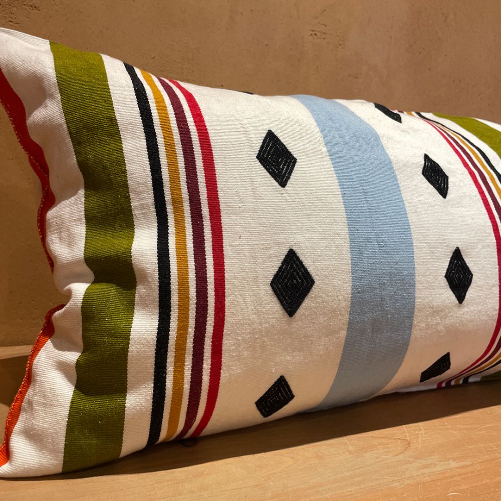 Elaborado por artesanas de Batsitetik esta colección fue el resultado de un taller que se realizó en la asociación con la mayoría de las artesanas con las que trabajamos. En el taller se les dio el material y una paleta de color especifica creada por la diseñadora del Camino de los Altos y ellas crearon las colecciones en comunidad. Se sugiere que el uso del cojín sea en casa o en un lugar cerrado ya que dará ambiente hogareño a su espacio.