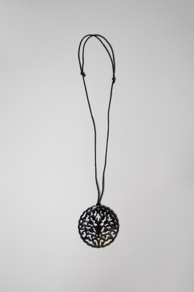 I said of recovered bull horn, carved with openwork that simulates the peacock motif, complemented with a long cord of waxed thread. This handmade piece stands out for its detailed design and the use of recovered materials.