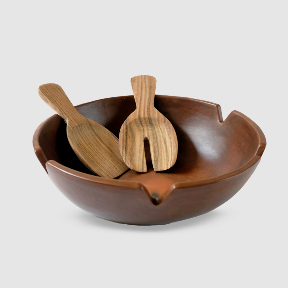Ensaladera modelada en barro con cucharones de madera de cueramo, elaboradas por artesanos nahuas de Cachán de Echevería, Michoacán. Esta comunidad costera de Michoacán tiene una larga tradición en el trabajo de la madera, las fibras naturales y el barro desde épocas prehispánicas. Las piezas son modeladas y talladas a mano de manera tradicional, utilizando machete, angaro y diferentes lijas. La ensaladera se quema en un horno de leña libre de humo.