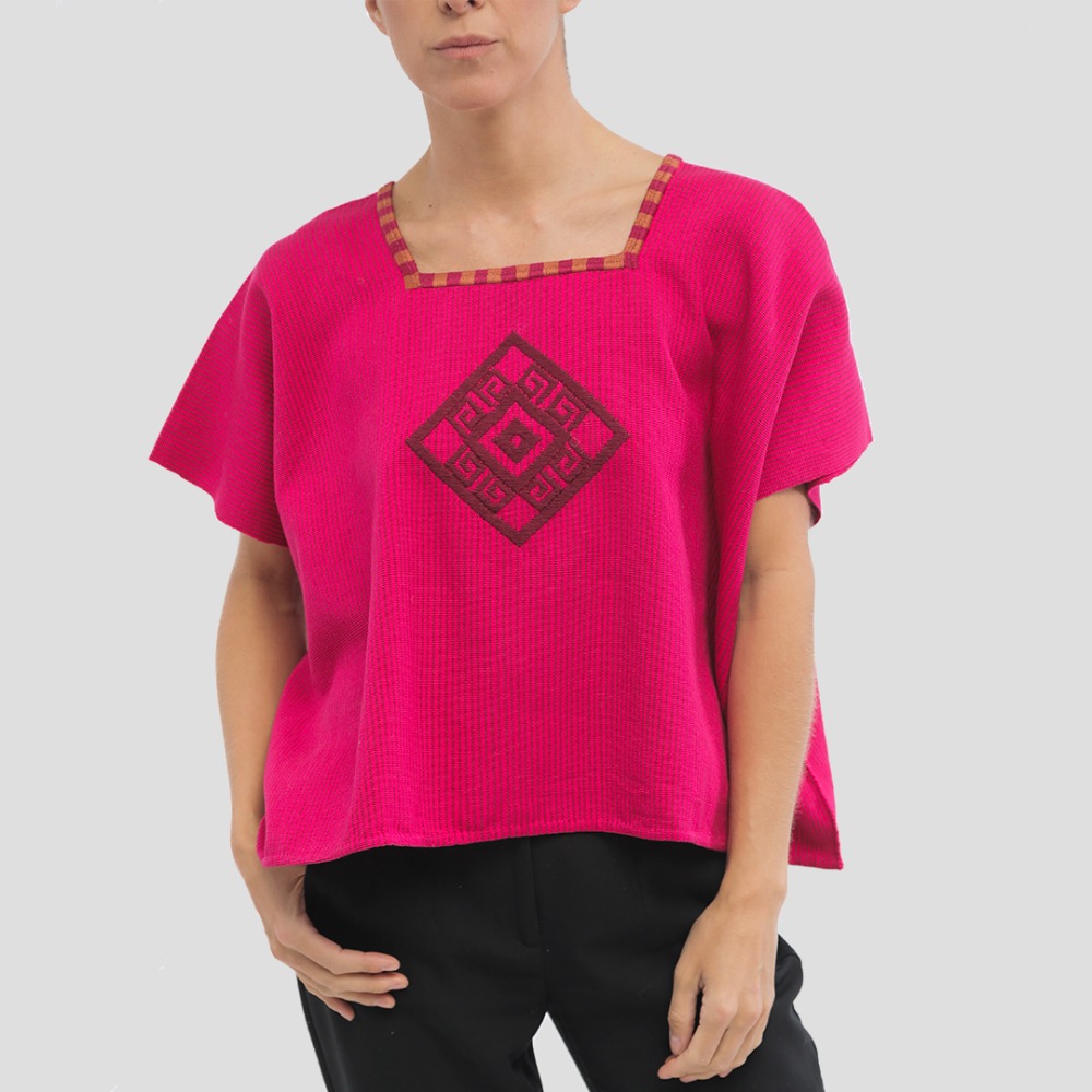 El Huipil Aldama Fresa recrea el estilo del huipil de uso diario, con un brocado mínimo y bordado alrededor del cuello sobre una base de delgadas líneas que alternan dos colores. Esta prenda ha sido tejida en telar de cintura por talentosas artesanas que plasman su habilidad y cosmovisión en cada detalle.