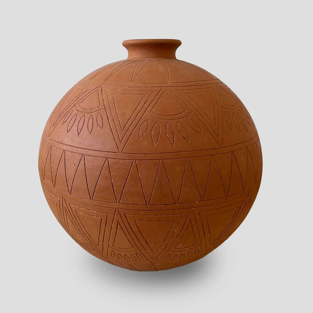 El jarrón esfera decorada es una pieza de gran formato modelada y detallada a mano en barro natural por un taller tradicional de Jalisco, México. Es un diseño original del taller de don armando que hizo como edición limitada para ensamble artesano.