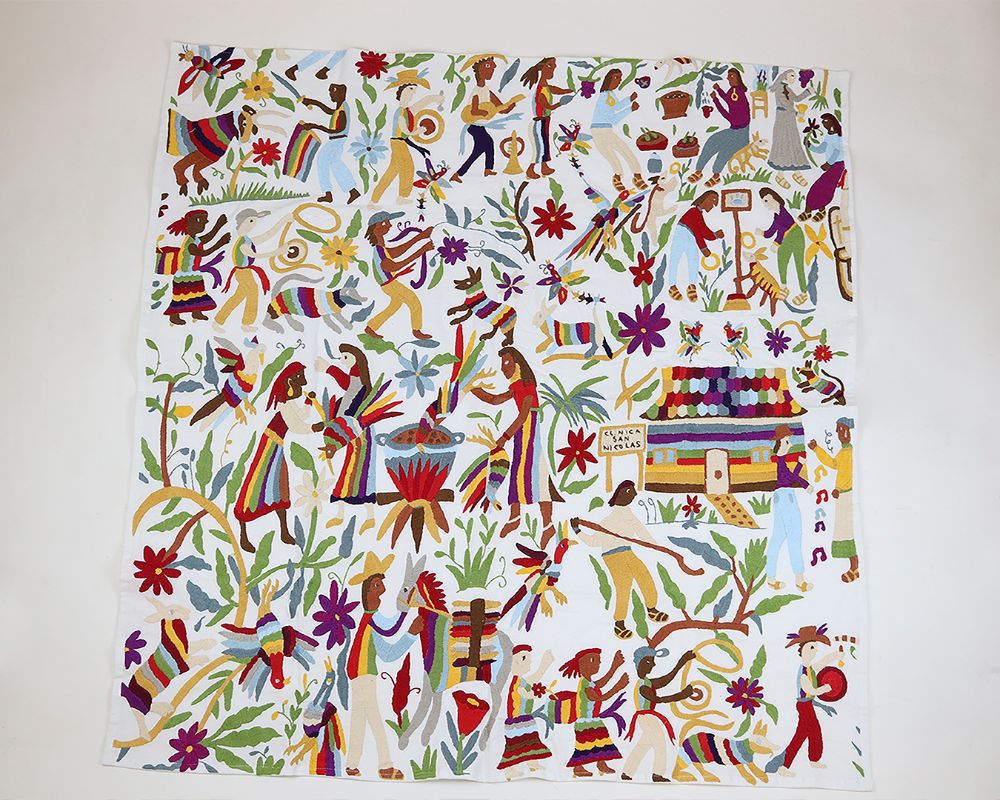 The canvas "La Comunidad" is a unique textile piece embroidered on cotton cloth with threads of different colors of the same material. The embroidering craftswomen of San Nicolás, Hidalgo captured a day in their community on this canvas, making it a life record piece, which makes it a collectible item. This canvas can be displayed in large spaces.