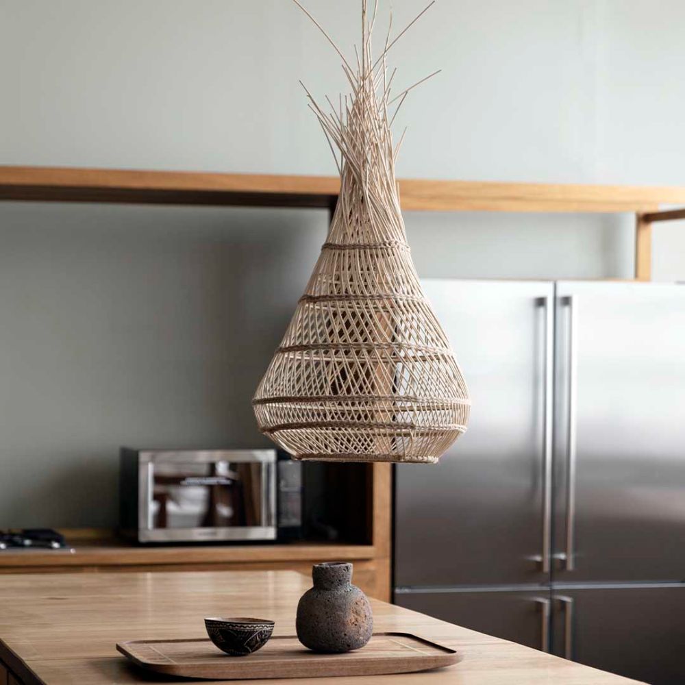 Tequisquiapan se carateriza por ser una de las principales cunas de la cetería utilitaria en el centro del país la habilidad por el tejido de diferentes objetos ha sido heredada por generaciones quienes han cultivado el oficio a lo largo de los años. Luminaria en mimbre y yute, calado que permite difuminar la luz.