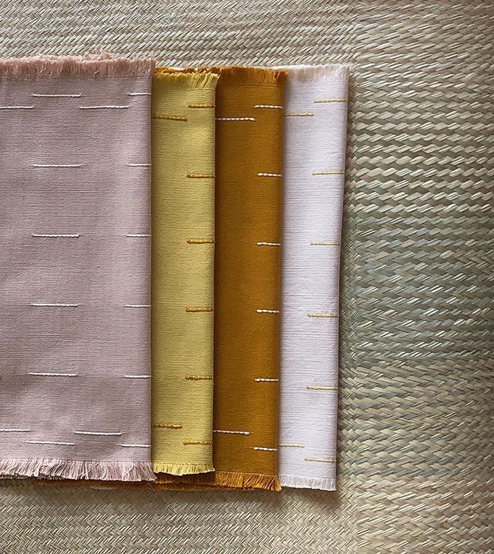The set includes: 2 beige individual tablecloths, 2 yellow, 2 mustard, and 2 white.