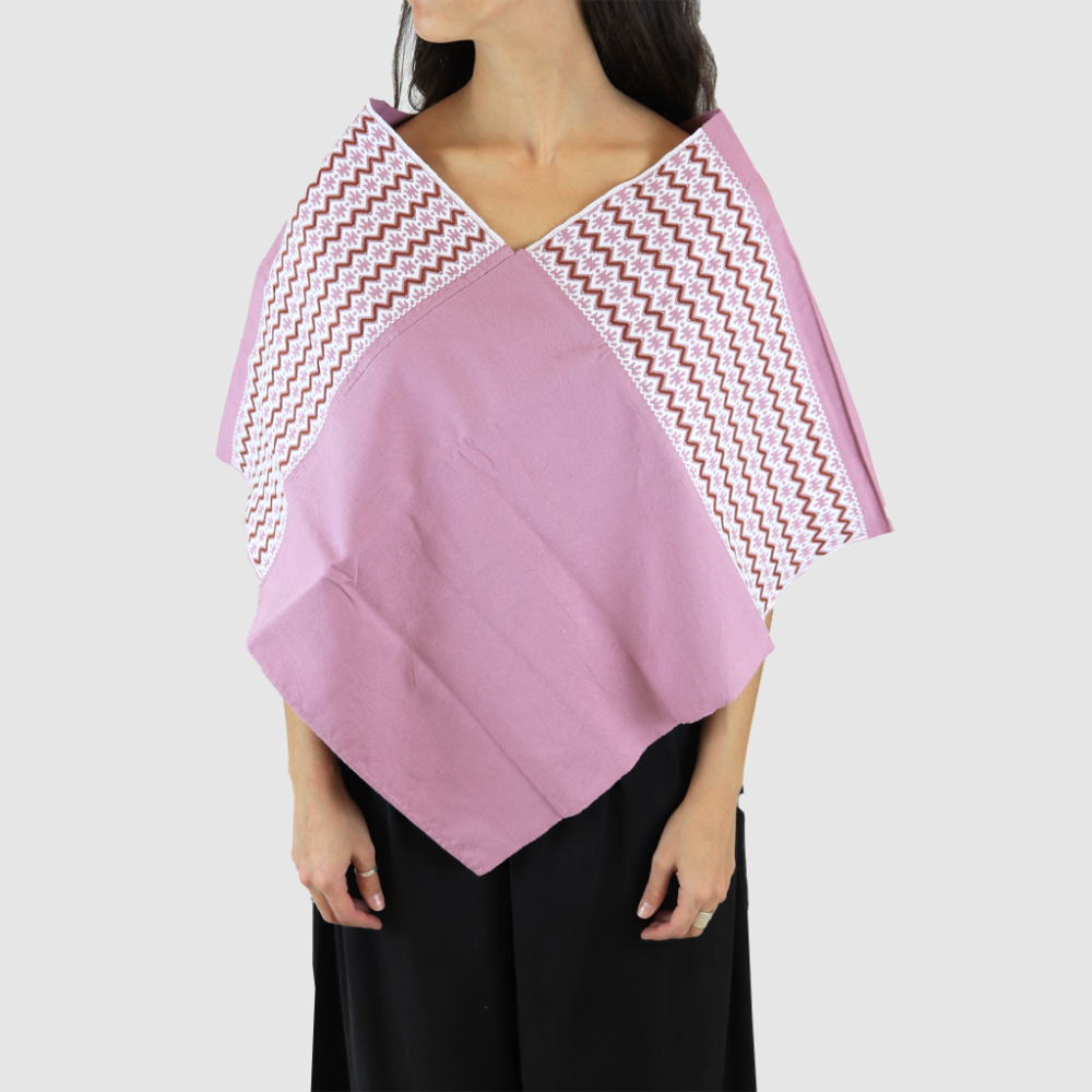Esta prenda de vestir llamada quechquémetl o quechquémitl está tejida en telar de cintura con un diseño conocido como “Paloma”, por artesanas de Chichelahló en Chiapas. En su técnica de tejido han dispuesto líneas de colores contrastantes para hacer un diseño único. Las mujeres tejedoras también hicieron las uniones, acabados y detalles totalmente a mano. Lleva algunos detalles de brocado de manera discontinua para dar mayor sutileza a la pieza.