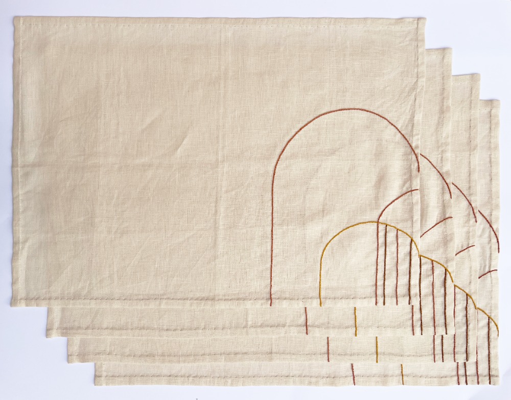 Individual tablecloths, a set of 4 pieces embroidered in industrial linen that capture the abstraction of elements and forms of the landscape, creating evocative arches.