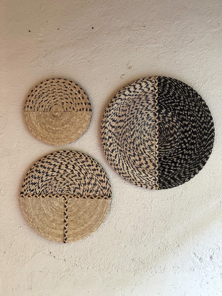 Nuestros productos están hechos por artesanos de la Sierra de Guerrero, en Chilapa de Álvarez, el tejido de cinta es una habilidad ancestral así como el armado de cestería y diversos artículos, nuestro grupo artesanal está conformado por 30 personas quienes intervienen en cada uno de los procesos productivos, desde el tejido de cinta, pasando por el teñido y costurado de cada pieza.La técnica de teñido fue creada en colaboración con nuestro de diseñadores y artesanos innovando en procesos y acabados. Decorativos costurados en palma con teñido especial en técnica de soyate pinto.