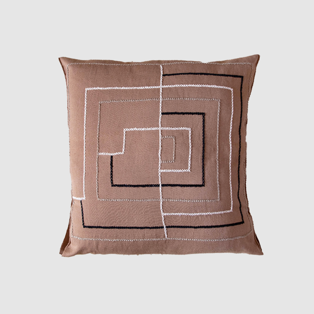 Set de dos cojines de algodón tejidos en telar de cintura en el municipio de Cancuc, Chiapas. Posteriormente el grupo “Las Azucenas” en Sitalá, perteneciente al mismo estado, bordó estas telas con punto de cruz, usando un lienzo de cuadrillé encima del lienzo de telar para seguir el patrón de diseño.