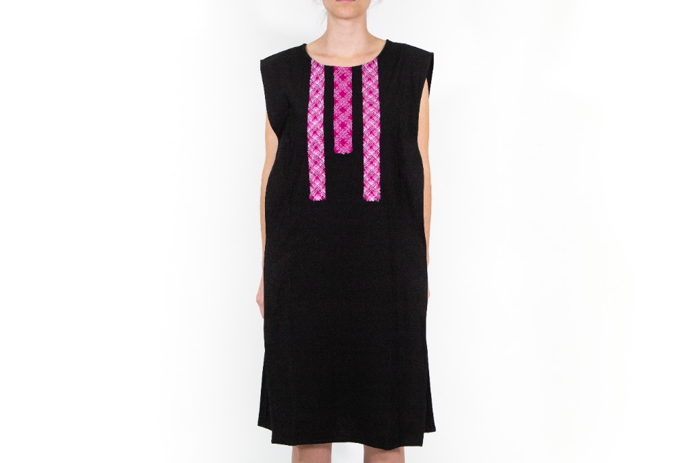 La Túnica Istmo Negra está hecha con tela de algodón y bordado con la tradicional técnica de cadenilla, típica de la región del Istmo de Tehuantepec en el estado de Oaxaca. El diseño se ha estilizado manteniendo la iconografía de la localidad. Esta pieza