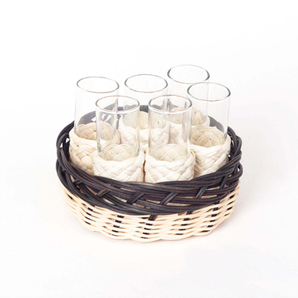 Juego de canasta y porta tequileros tejidos con mimbre con borde en color natural. Incluye 6 vasos tequileros forrados con rejilla natural. El tejido está hecho por los grupos: el Manzano y Mesa Rica originarios de Valle de Bravo en el Estado de México.