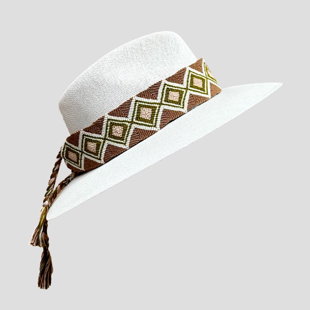 La Toquilla con diseño de rombos en tonos verdes y tabaco es una obra maestra artesanal, cuidadosamente anudada a mano por talentosas artesanas de San Juan Chamula, Chiapas. Confeccionada con hilos de algodón resistente, su excepcional diseño y tamaño la convierten en el complemento perfecto para añadir un estilo único a tus sombreros.